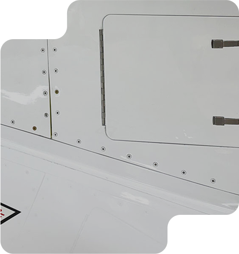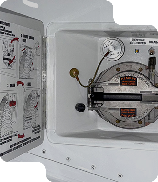 The new external service panel is installed on the left side of the aircraft, aft of the wing in the aft fuselage fairing. The service panel features an aviation standard 4” waste drain fitting, a blue water service fitting, an LED light indicating the status of the toilet system, a switch to power the integrated macerator pump, and a switch to service (fill) the system with water and deodorizer. This external service panel is fully compatible with standard aviation industry ground service equipment, making it a breeze to service at any FBO or service facility.
